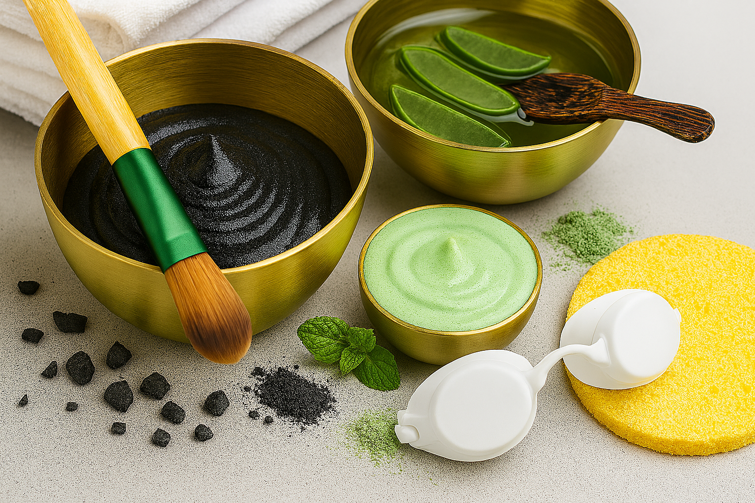 Bentonitový jíl stahuje póry, mátový a rozmarýnový olej okamžitě osvěžují a tonizují.